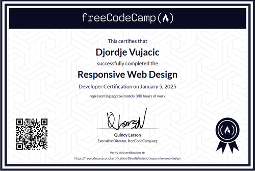 Gained a solid foundation in JavaScript, mastering essential programming concepts, ES6 features, and algorithmic problem-solving. Through this certification, I builded proficiency in object-oriented and functional programming, preparing myself for real-world coding challenges and technical interviews.